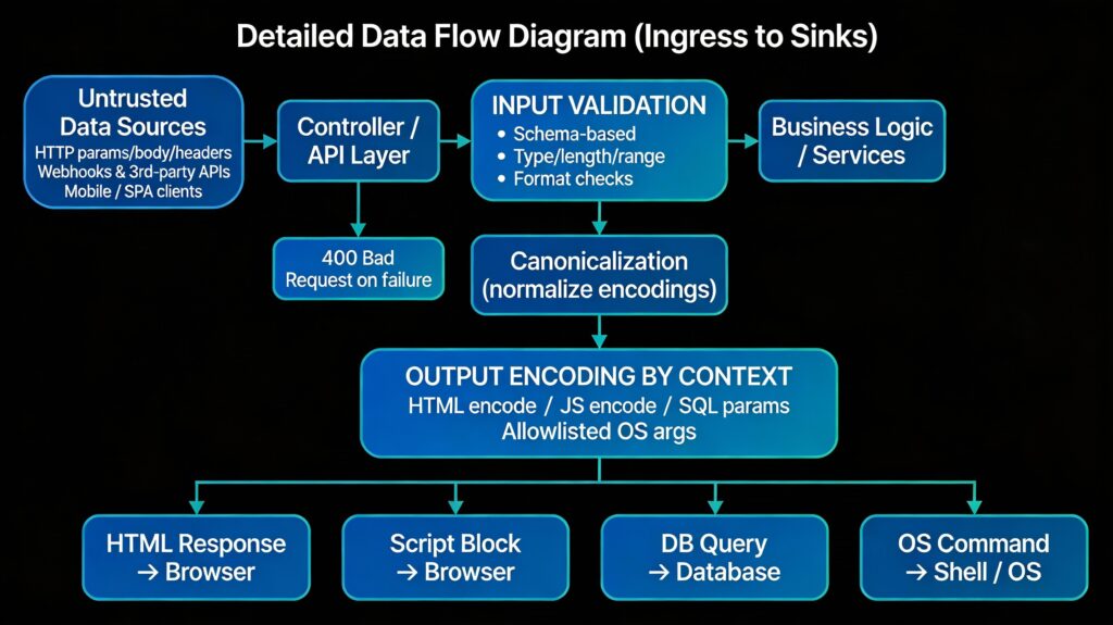 For Niyava-like architectures – API-first backends, dashboards, admin consoles, and integrations – untrusted data flows in from everywhere: HTTP parameters, JSON bodies, headers, message queues, third-party webhooks, and internal services. Treating all such data as hostile until validated and encoded is a foundational secure coding habit.